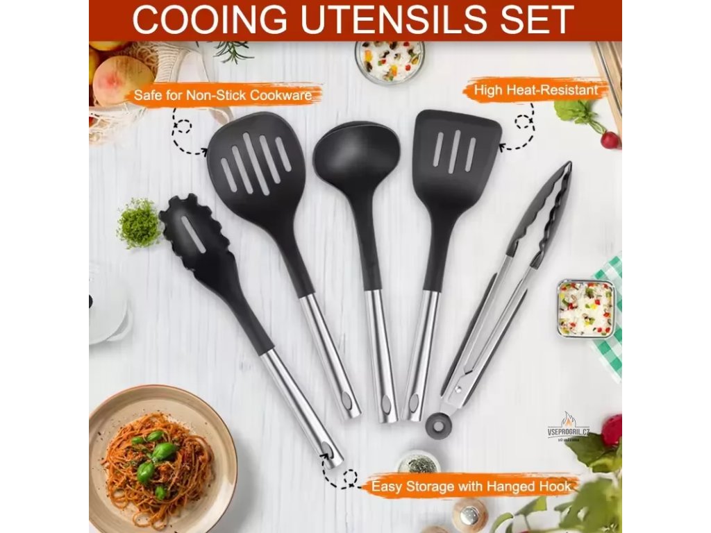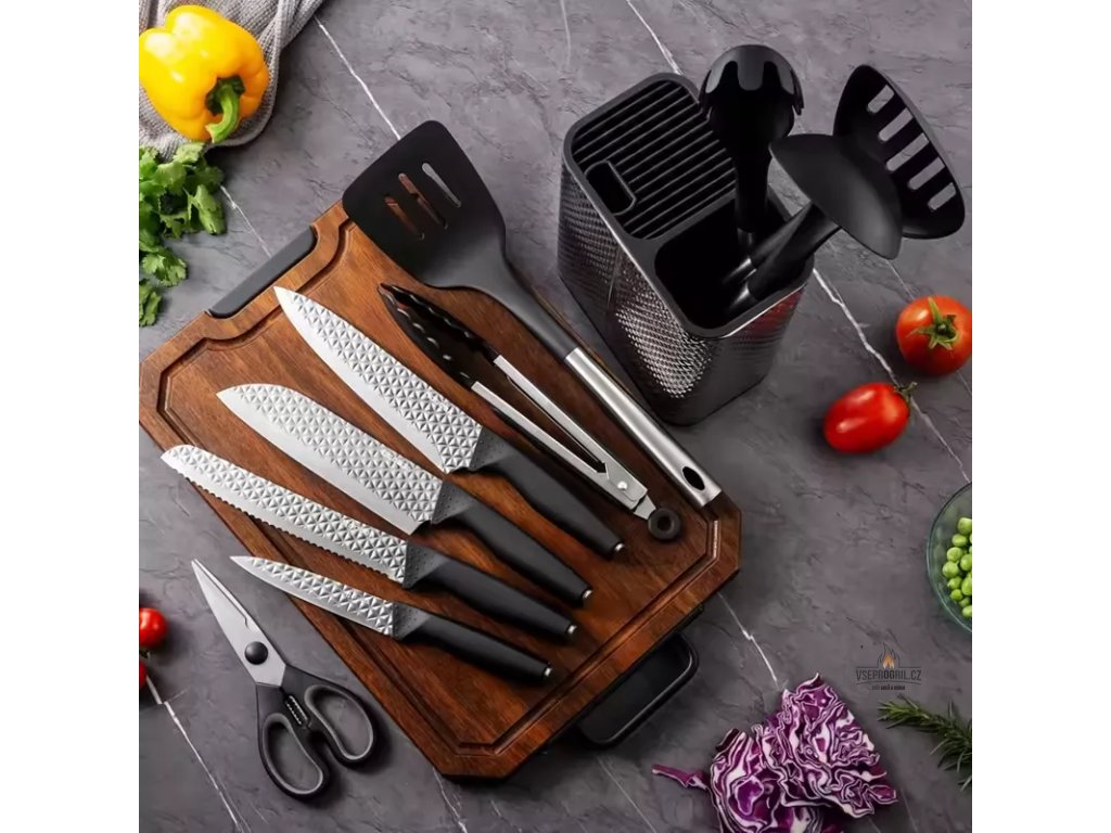 11-dílná sada kuchyňských nožů a nářadí se stojanem.