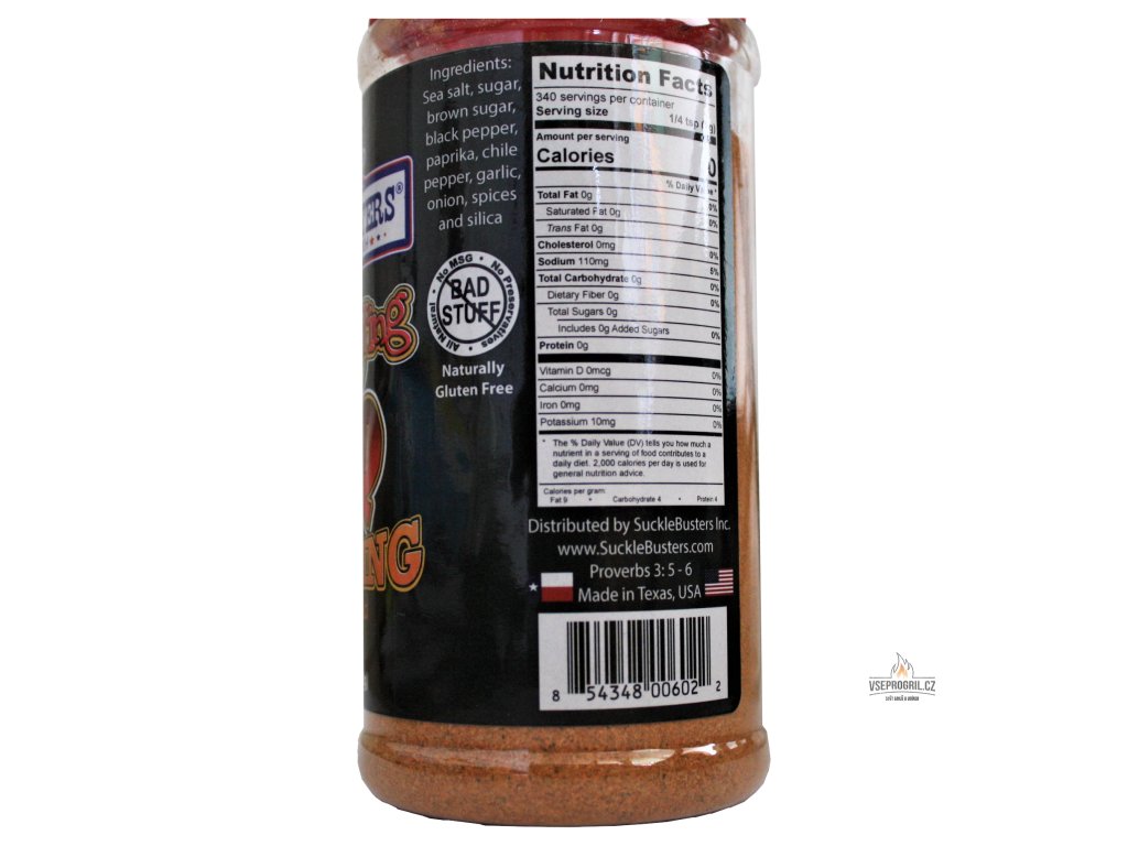 BBQ směs koření Chicken Wing BBQ Seasoning Suckle Busters se skvěle hodí především na kuřecí Složení: mořská sůl, cukr, hnědý cukr, černý pepř, chilli papričky, česnek a cibule, koření a oxid křemičitý-protispékavá látka Bez lepku, MSG Vhodný pro vegetariány a vegany