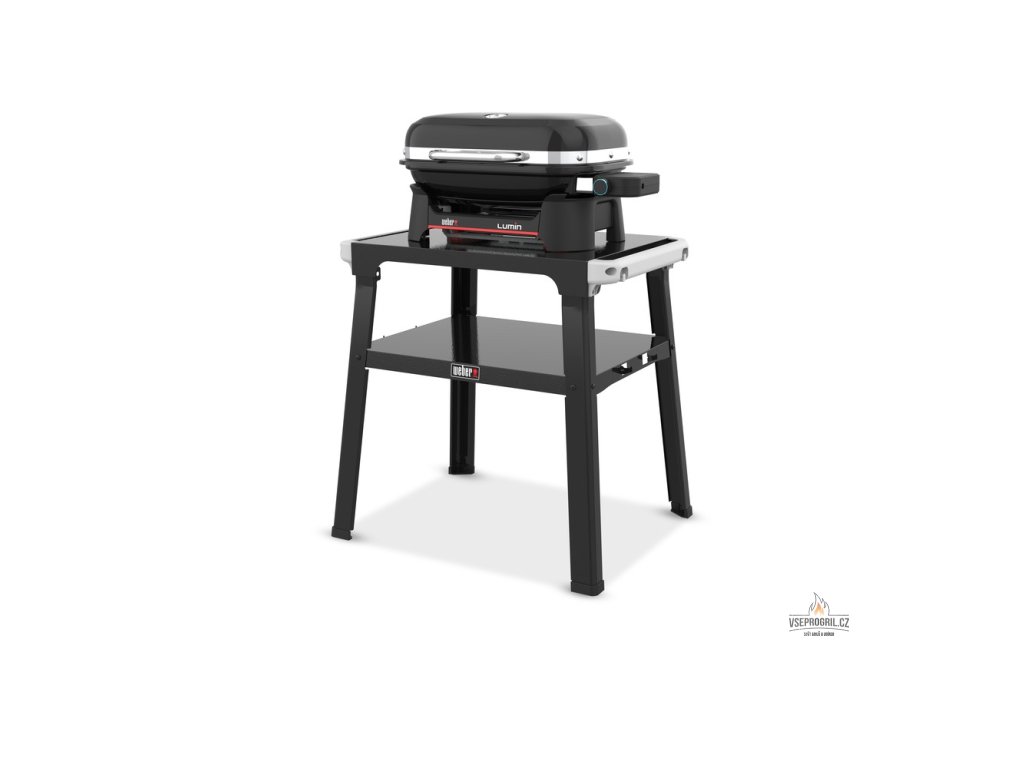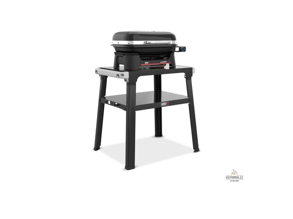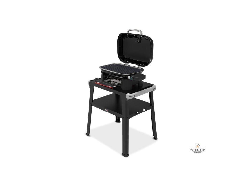 - Podstavec grilu z odolného plastu tvoří nosnou konstrukci se čtyřmi nožičkami. Gril lze postavit na stůl, nebo připevnit na dodaný stojan, čímž získáte vhodný podstavec a můžete grilovat v ideální pracovní výšce, na straně podstavce jsou háčky na nářadí a pod grilem velká odkládací police. Gril je připevněn pomocí jednoduchého mechanismu se snadnou montáží a demontáží grilu.
