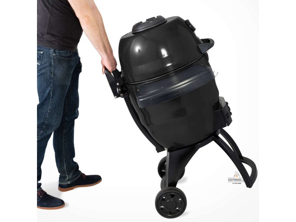 Tělo grilu KEG 5000 je uloženo v kovové konstrukci opatřené v zadní části dvěma velkými kolečky pro snadné přemístění. Boční poličky s háčky využijete především při manipulaci s potravinami a pro uložení případně zavěšení grilovacích pomůcek.
