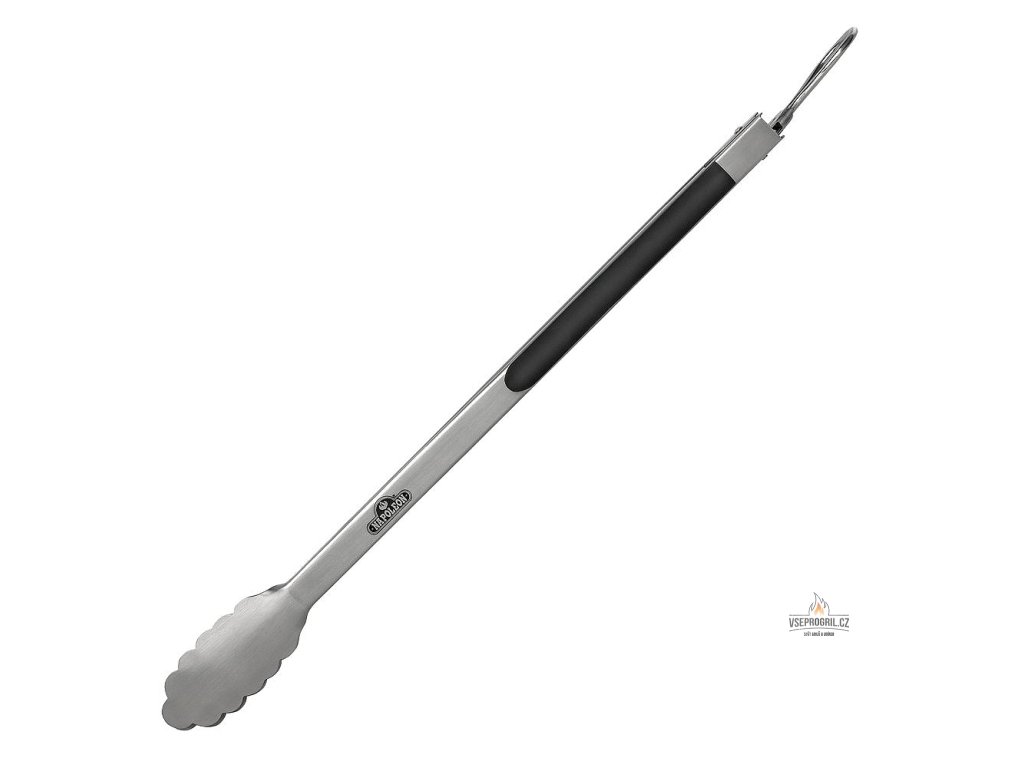Nerezové grilovací kleště se zámkem, určené pro manipulaci s pokrmy při grilování.
