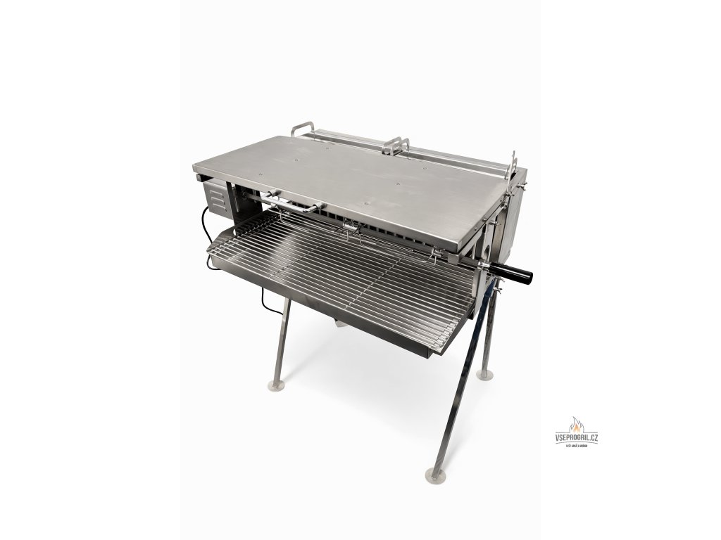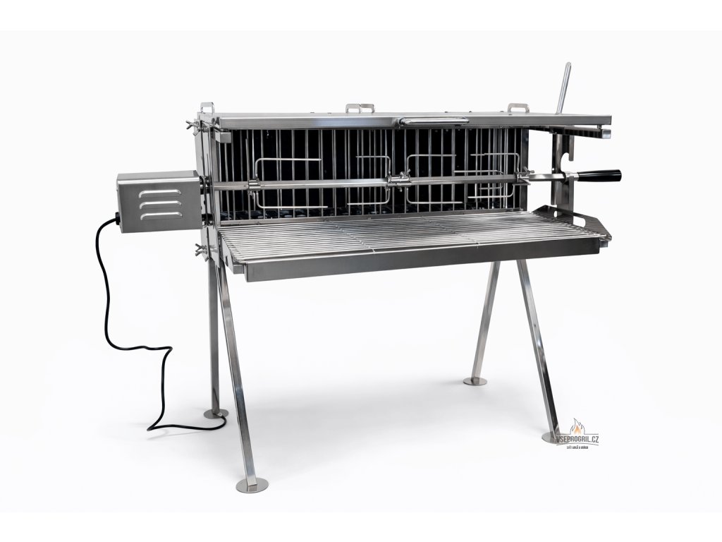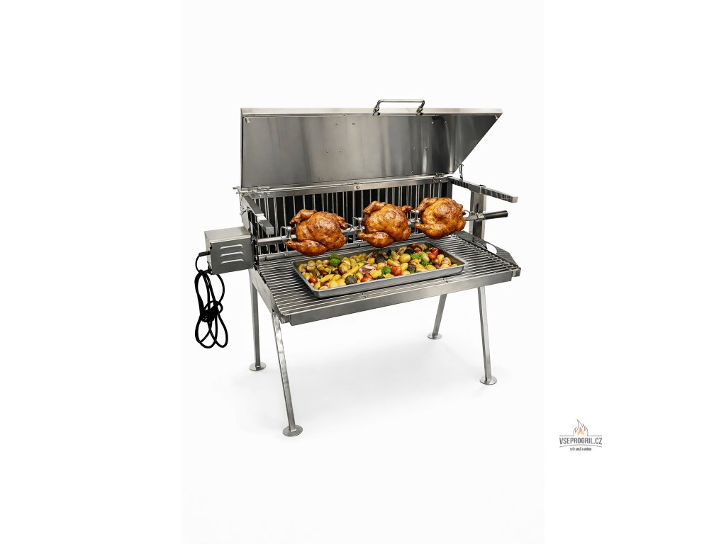 - Praktické příslušenství: Gril je vybaven odkapávací miskou a nastavitelnou rotisserií s nastavitelnými držáky na maso (4ks). Odkapávací plech lze posunovat a upevňuje se pomocí křídlových šroubů. Na odkapávací misku lze položit rošt o rozměrech 100x34cm pro další maso a přílohy (je součástí grilu).