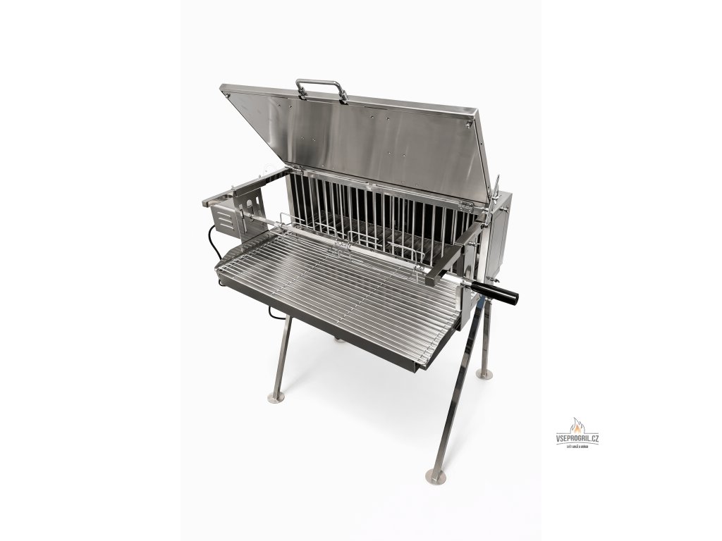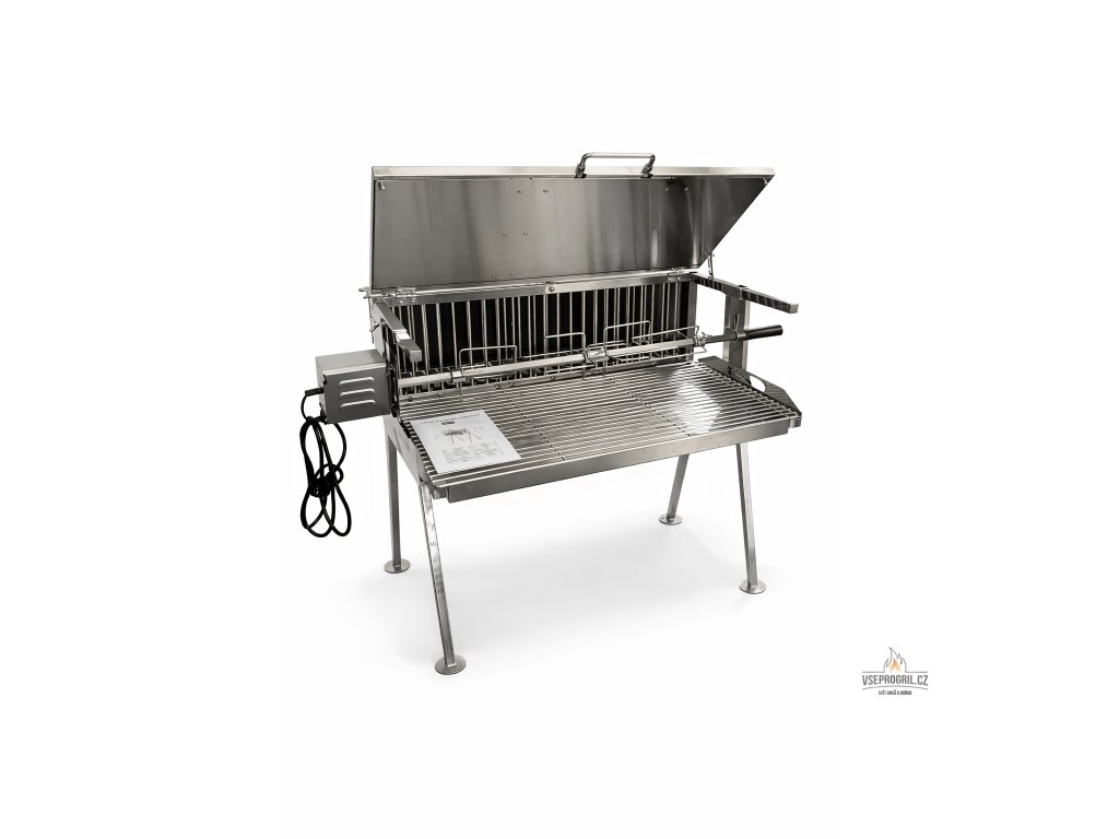- Nastavitelné víko: Zahrnuje nerezové víko, které je nastavitelné a zajišťuje lepší propečení masa na rotiserii.