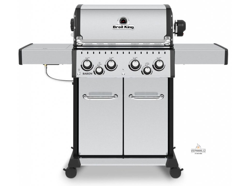 Broil King - Baron S 490 IR v základní výbavě disponuje čtyřmi hlavními hořáky, bočním vařičem a elektrický rožněm s přídavným zadním hořákem pro rožnění. Baron S 490 IR nabízí sílu a výkon s řadou prémiových konstrukčních řešení jako je dvojité víko, robustní oboustranné grilovací litinové rošty (ostré hrany roštu jsou ideální pro přípravu steaků, otočením získáte rošt se žlábkem, který se skvěle hodí pro grilování kuřecího masa, zeleniny a dalších drobnějších potravin), jedinečné ohřívací mřížka (tzv. druhé grilovací patro využijete především pro ohřívání pokrmů či nepřímé grilování), kryty hořáků Flav-R-Wave ™ z nerezové oceli, čtyřmi patentovanými hořáky Dual-Tube ™ z nerezové oceli či ventily s plynulou regulací výkonu Linear-Flow ™ pro přesné ovládání teploty.