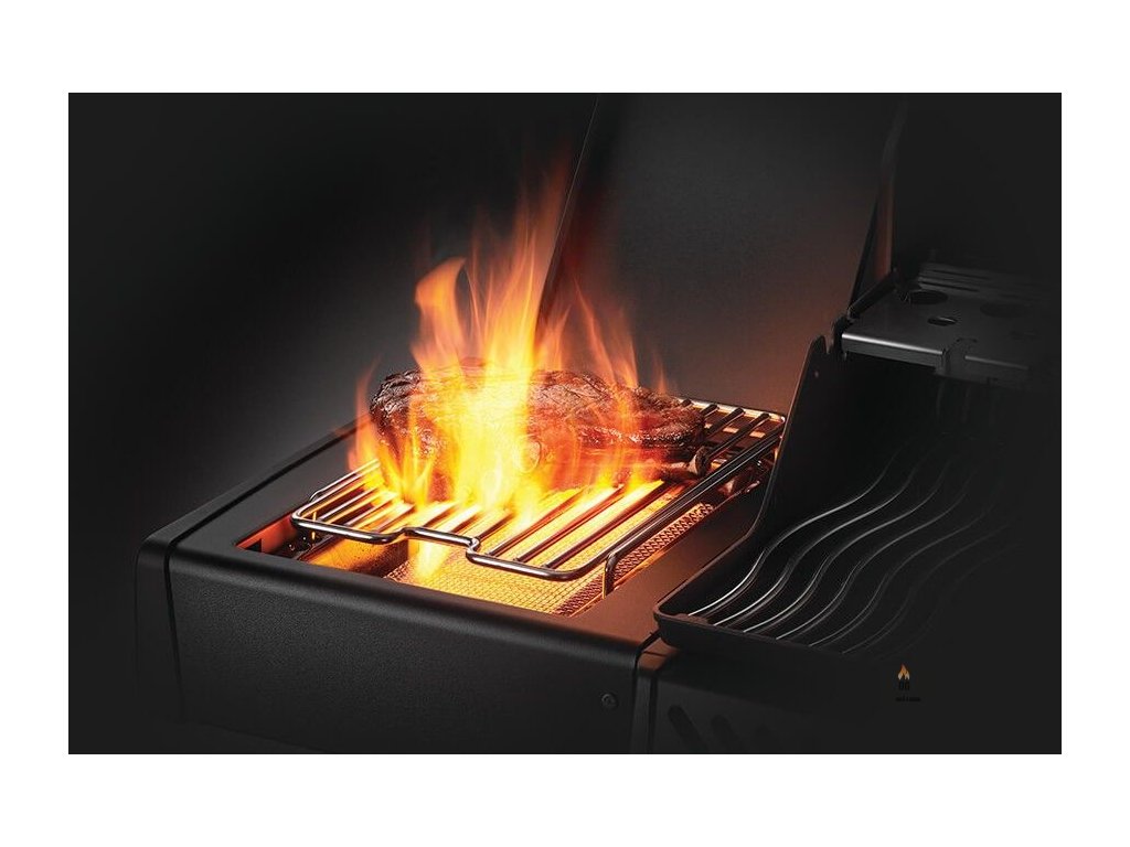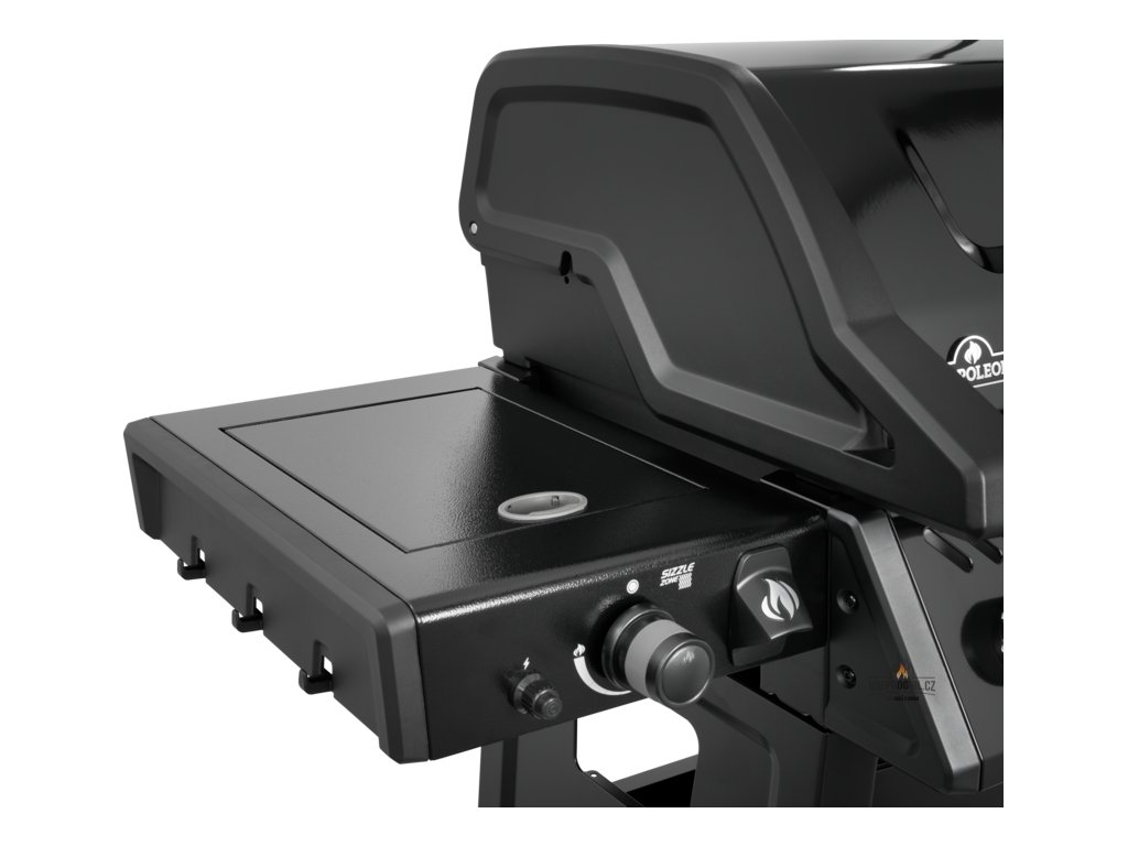 Boční infračervený hořák SIZZLE ZONE s teplotou až 800 °C pro rychlé zatažení steaků před samotným grilováním, který slouží zároveň jako postranní vařič.