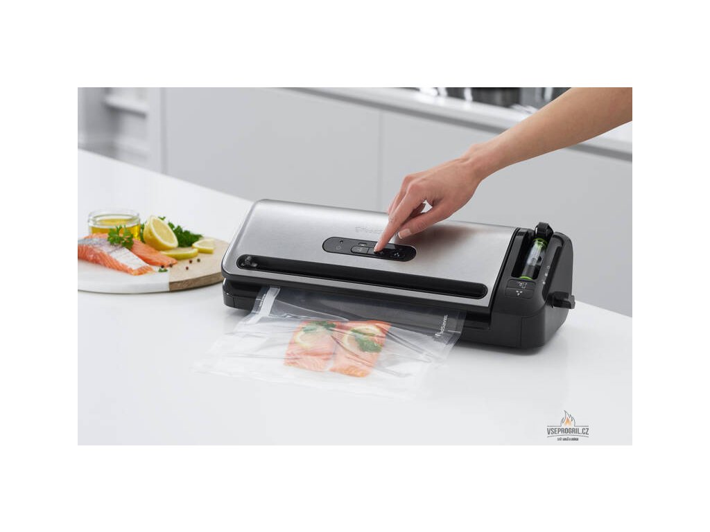 Pomocí vakuového těsnicího systému FFS017X FoodSaver můžete jednoduše vysávat potraviny s jedním dotykovým tlačítkem. Jednoduše vložte kapsa na potraviny do zásobníku a zavřete jej jednoduchým uzamykacím mechanismem. Zařízení automaticky odstraní vzduch z kapsy stiskem tlačítka. Pomocí indikátoru odsávání zjistěte, kdy bylo započata vakuování. Po úplném odstranění vzduchu začne zařízení s tepelným uzávěrem na utěsnění čerstvosti v kapse.